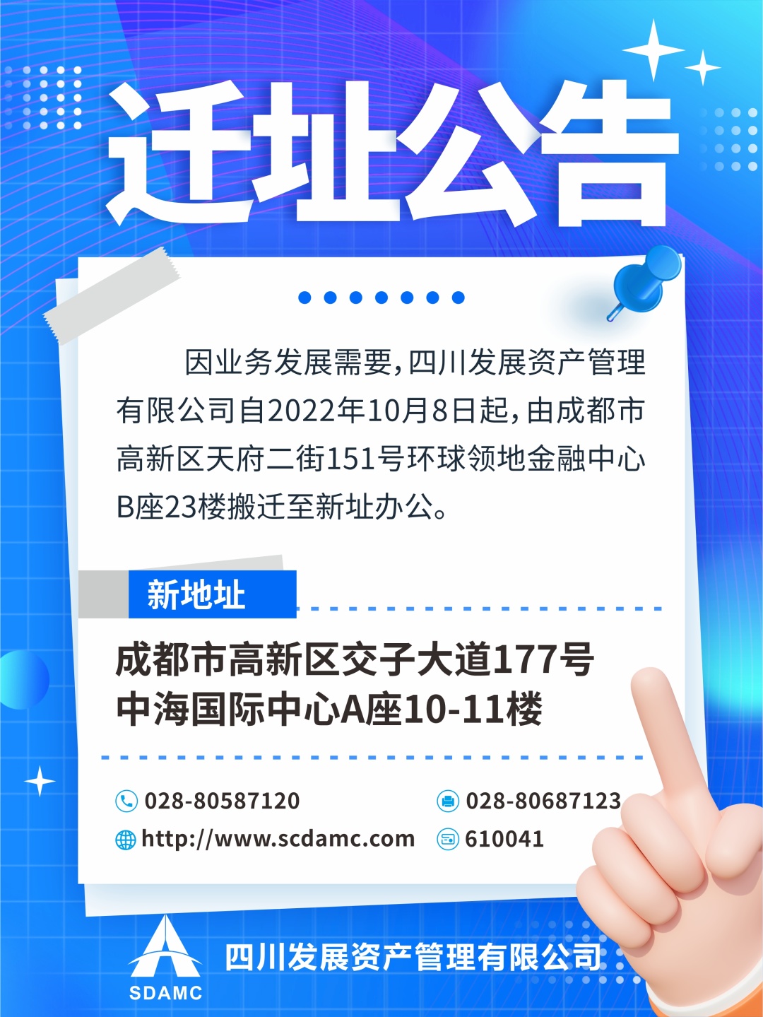 因業務發展需要,四川發展資產管理有限公司自2022年10月8日起,由成都市高新區天府二街151號環球領地金融中心B座23樓搬遷至新址辦公。