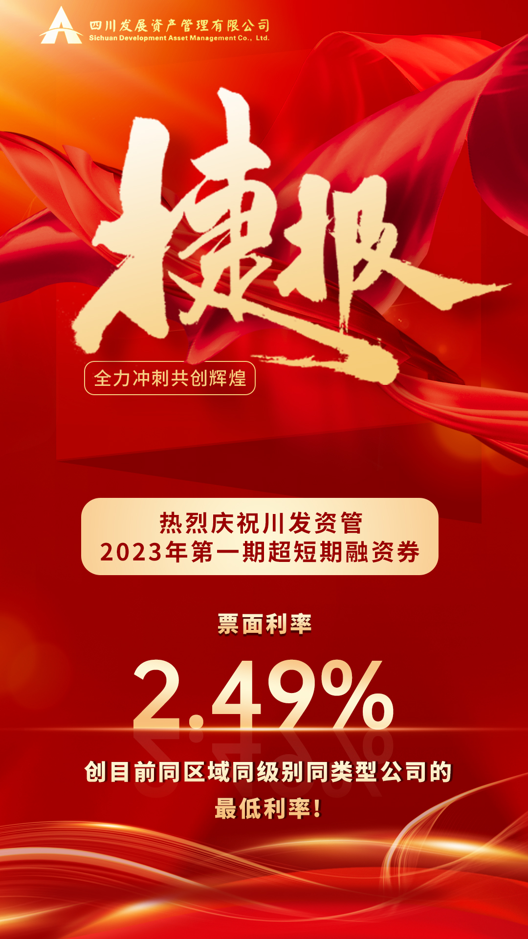 2023年7月24日,四川發展資產管理有限公司2023年第一期超短期融資券在北金所成功發行,發行規模3億元,期限180天,由興業銀行承銷。本期債券發行獲大量投資者關注,全場認購倍數達2倍,最終取得2.49%的票面利率,為目前同區域同級別同類型公司的最低利率。
